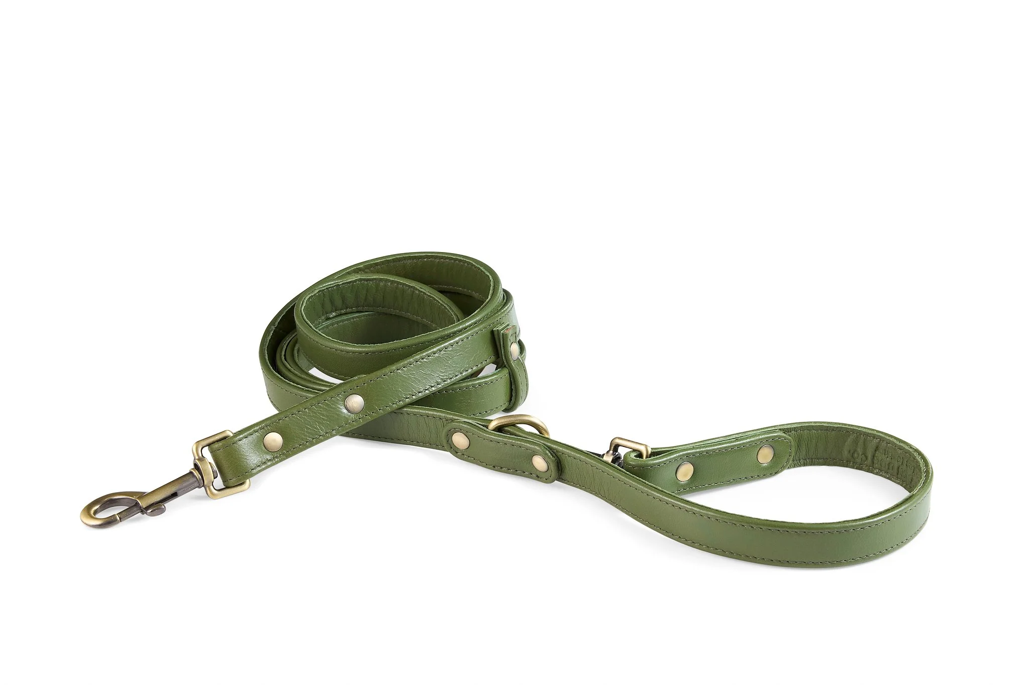 Meet the ultimate everyday essential from The Golden Dog Co. This 3-in-1 genuine leather dog leash is a true jack-of-all-trades, combining fashion and function in one versatile design. Crafted from premium olive green leather, this luxury leather dog leash is soft, durable, and built to last.