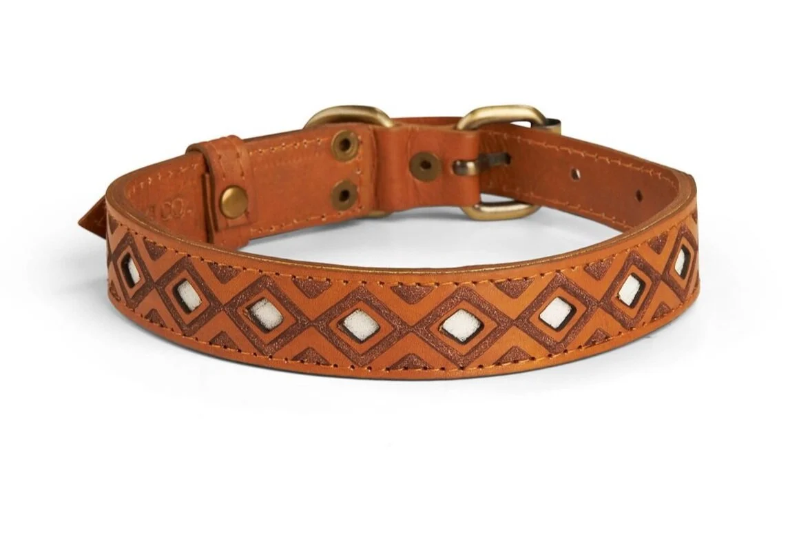 Handcrafted with tan and white leather. Our Lahaina Collar is inspired by the white sand beaches on the island. This two-toned hand carved tan leather dog collar with white leather diamonds was built to ensure durability and comfort. Complimented with non tarnishing brass accents, this leather dog collar includes a D-ring for attaching tags and leashes.