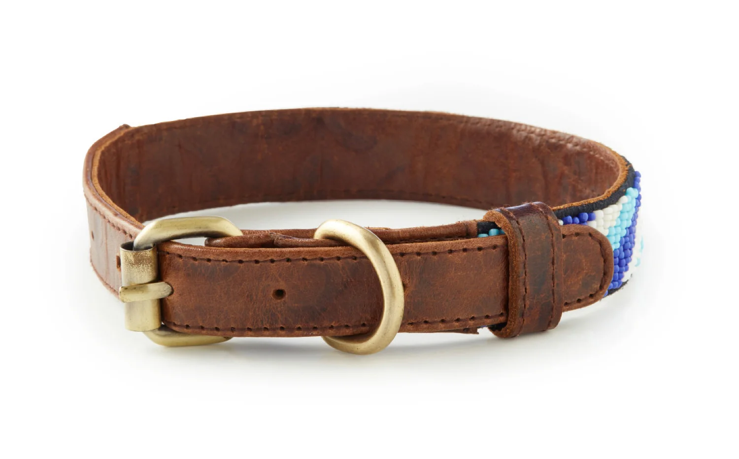 The Uluwatu Collar. When quality and design collide. This collar is a favorite from our Bali Collection. Bringing in the colors from the clear blue waters of Uluwatu, this hand-beaded, Italian leather dog collar was built to ensure durability and comfort. Complimented with non-tarnishing brass accents, this dog collar includes a D-ring for attaching tags and leashes.